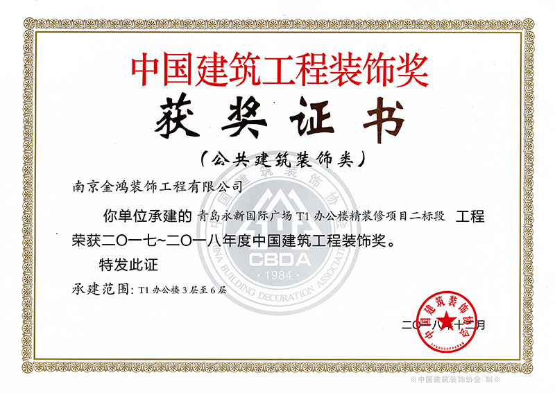 青島永新國際廣場(chǎng)T1辦公樓裝飾施工榮獲2017-2018年度“中國建筑工程裝飾獎(jiǎng)